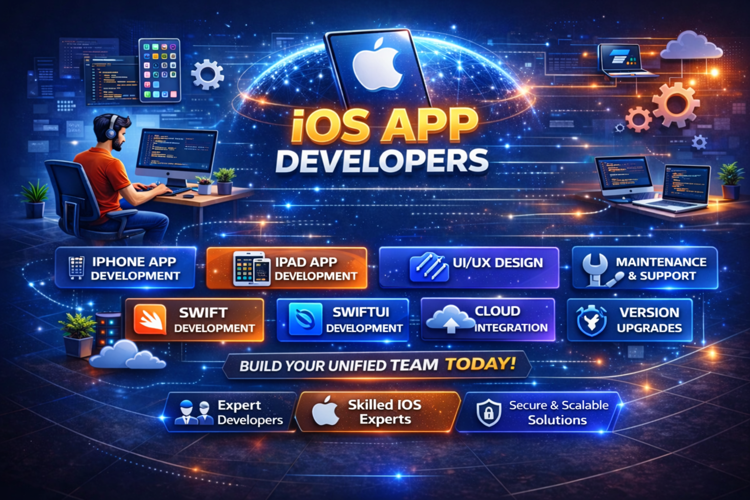 Hire iOS experts skilled in Swift, Objective-C, UI/UX design, third-party integrations, and the latest iPhone SDK to deliver secure, responsive, and high-quality native and cross-platform applications.