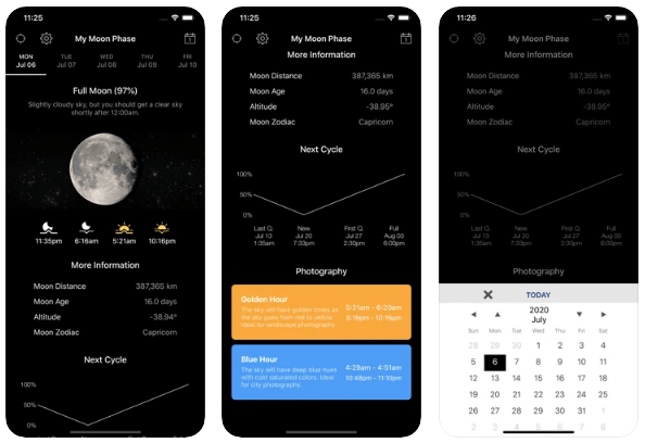 Photographers will appreciate the clear interface of My Moon Phase, as it includes information about the golden hour and the blue hour — when the moon will be in a particular position of the sky best suited for taking specific photos.